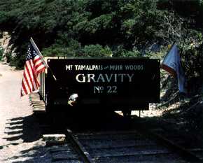 Traversing the double bow-knot, locals and tourists alike delighted in jaw-dropping vistas as they reached the 2,571 foot summit at East Peak for a day of unparalleled sightseeing, dinner at the Tavern of Tamalpais and dancing in the Pavilion. At day's end, the daring would climb aboard the Gravity Car, and the "Gravity Man" would "turn on the gravity", and down they would coast over 8 1/4 miles, around 281 turns on the mountain's 7 % grade to the Mill Valley depot or Muir Woods. This was clearly the "E" ticket ride of its day!